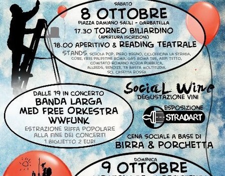 Aspettando con ansia il traguardo della maggiore età, l’8 e il 9 Ottobre il Centro Sociale La Strada si appresta a festeggiare i suoi 17 anni di attività. 17 anni di lotta, partecipazione e promozione culturale che quest’anno saranno festeggiati portando nelle piazze e nelle strade della Garbatella una piccola e parziale sintesi dei progetti che nel corso delle ultime stagioni sono prosperati all’interno dei locali di Via Passino 24. Si comincia Sabato 8 Ottobre a Piazza Sauli con alcuni reading teatrali dalle ore 17.00 ed un torneo di Biliardino aperto a tutti e tutte; con il primo calare della sera inizierà quindi la serata musicale che vedrà alternarsi i virtuosismi jazzistici della BandaLarga all’esibizione della Med Free Orchestra che ospiterà sul palco ospiti del calibro di Andrea Satta, Claudio Fava, Corrado Fortuna, Gerardo Casiello e Raffaele Pinelli. La serata si chiuderà con il live dei WWFunk, vera promessa della scena musicale romana.