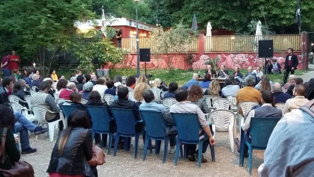 “La linea retta è una finzione”: forse queste parole, usate dallo scrittore Paco Ignacio Taibo II per rispondere a una delle domande giunte dal pubblico che lo ascoltava attento nel parco Cavallo Pazzo lo scorso lunedì, sono quelle che meglio descrivono lo spirito con cui è stato scritto A quattro mani, il libro appena pubblicato in italiano (traduzione di Pino Cacucci e Gloria Corica) dalla casa editrice laNuovafrontiera. Per Taibo si è trattato di un ritorno a Garbatella e a Casetta Rossa dopo l’incontro che esattamente un anno fa lo aveva visto protagonista insieme a – fra gli altri – Erri De Luca, Gianni Minà e Pino Cacucci. Il libro si inserisce all’interno di una produzione letteraria varia e consistente che abbraccia generi diversi: dal romanzo giallo (la serie con il detective Belascoarán Shayne) alla Storia (Senza perdere la tenerezza. Vita e morte di Ernesto Che Guevara o Un rivoluzionario chiamato Pancho) passando per altri romanzi come quello pubblicato nel 2005 con il Subcomandante Marcos (Morti scomodi).