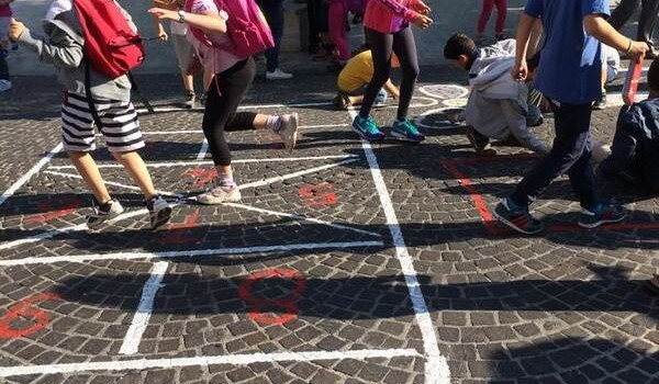 Così si sono alzati molto presto per disegnare il gioco della campana, collegando l’entrata della scuola alla piazza pedonale e far capire che quell’area è dei bambini, per i bambini, le insegnanti e i genitori e non può essere vissuta con ansia per il potenziale passaggio di veicoli a motore.