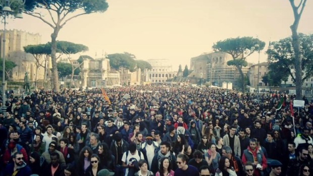 Il 28 febbraio il centro di Roma era diviso in due blocchi: il primo, in Piazza del Popolo, era per la maggior parte composto da nostalgici del ventennio buio della storia d’Italia – i numerosi cartelloni con l’effige del Duce ne erano testimonianza – formazioni neofasciste (Casapound in primis) alla ricerca di agibilità politica; orfani dell’epoca berlusconiana in cerca di poltrone e leghisti della prima ora – gli ultras secessionisti di Pontida – che a fronte di viaggi a costo zero hanno scoperto il loro lato nazionalista.