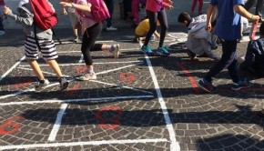 I bambini e i genitori del gruppo MuovitiOttavo festeggiano il primo anno di attività in piazza Sauli, davanti alla Cesare